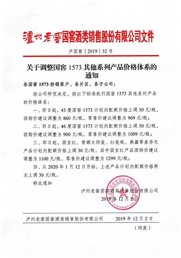 12月2日,澎湃新聞(www.thepaper.cn)記者獲悉,瀘州老窖向其經銷商下發《關于調整國窖1573其他系列產品價格體系的通知》。通知顯示: