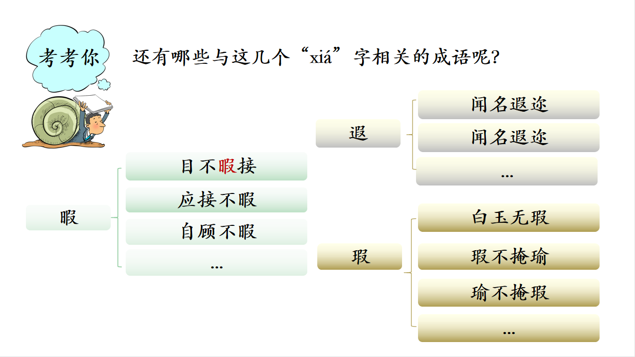 了解這些字義后,就可以很輕松地答題了:目不( 暇)接、( 瑕)不掩瑜、聞名( 遐)邇、應接不( 暇)、白玉無(瑕 )、自顧不( 暇)。你學會了嗎?即使不清楚這些成語的意思,也可以通過分析字的意義范疇來幫助我們作出準確的判斷。不過,真正地掌握成語知識,才是王道!
