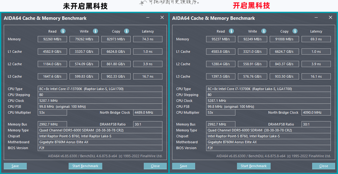 開啟XMP/EXPO以及技嘉的內存黑科技模式模式后,內存讀取、寫入、復制分別為95237MB/s、92249MB/s、91008MB/s,而延遲時間為69.3ns。