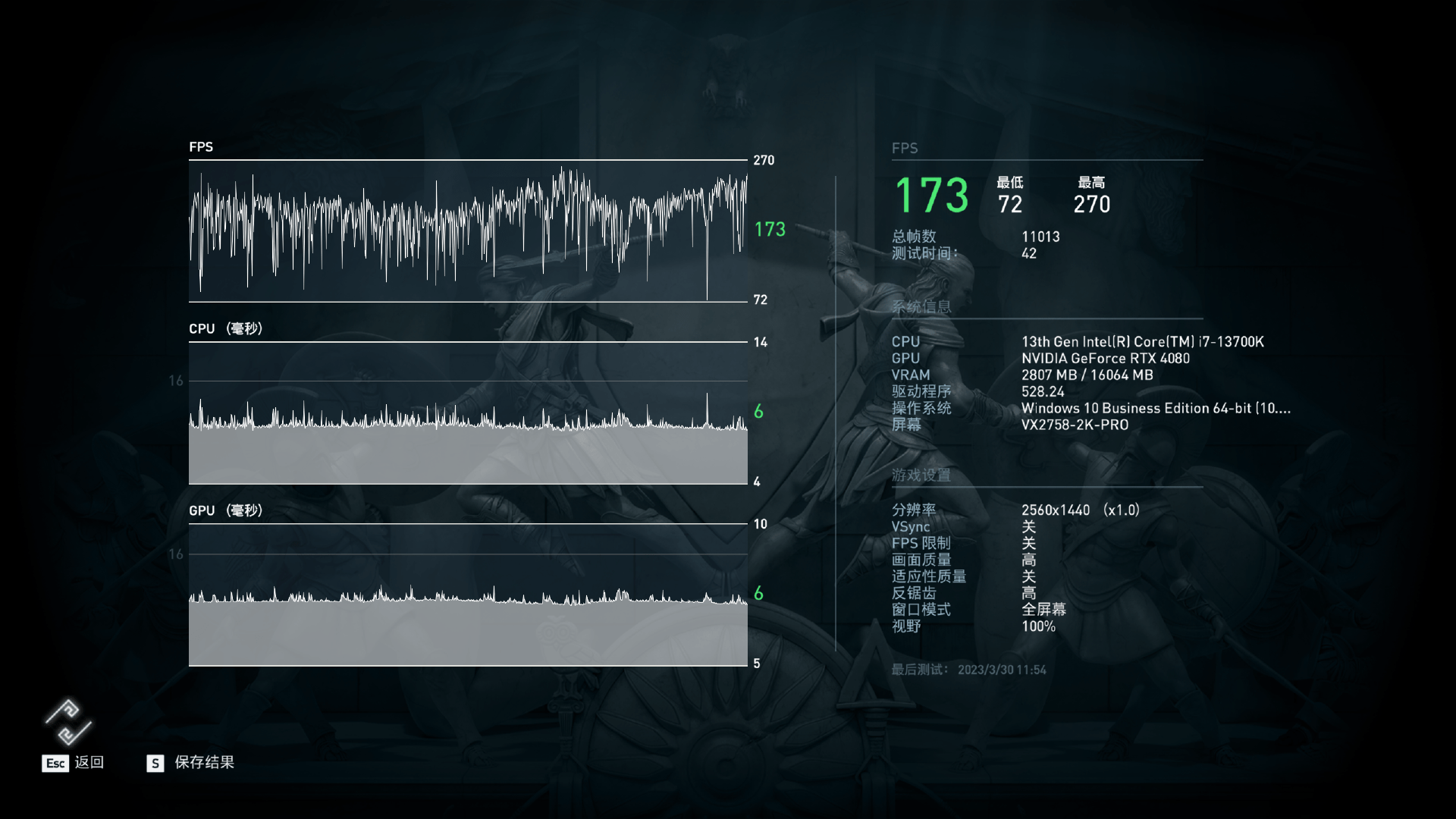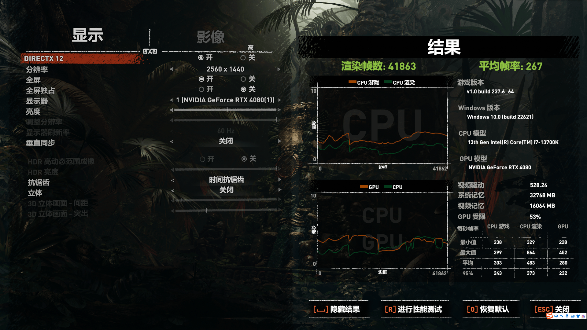 處理器為i7-13700K設置處于默認睿頻狀態,搭載最新Windows 11 22H2操作系統和NVIDIA 528.24 WHQL顯卡驅動,顯卡是索泰的RTX4080。