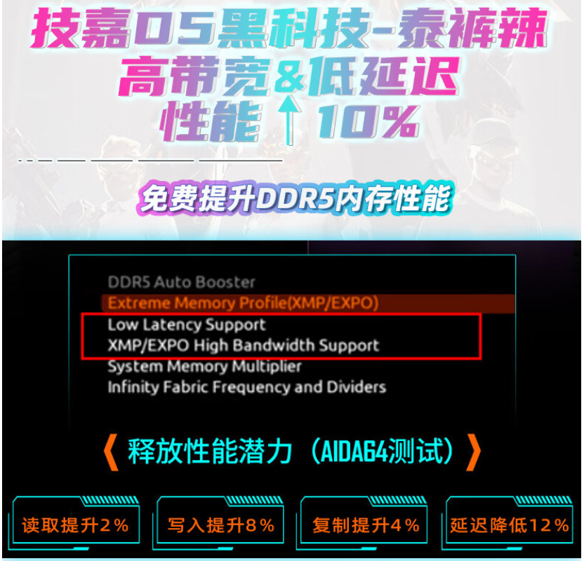 技嘉在這塊B760M AORUS ELITE AX WIFI主板上搭載了自家的黑科技---解鎖低延遲和高寬帶模式,可以全面提升DDR5內存的性能。簡單的解釋一下,如果你不會內存超頻,那么在開啟這個模式后,在同樣的內存頻率下,整體內存性能可以得到全面的提升。