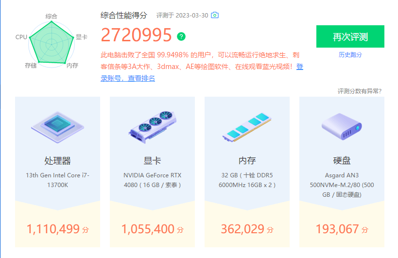 在開啟XMP/EXPO高帶寬&低延遲模式開啟,6000MHz下,娛樂大師跑分為2720995,其中內存得分為362029,在開啟黑科技后所有的硬件都有顯著的提升。