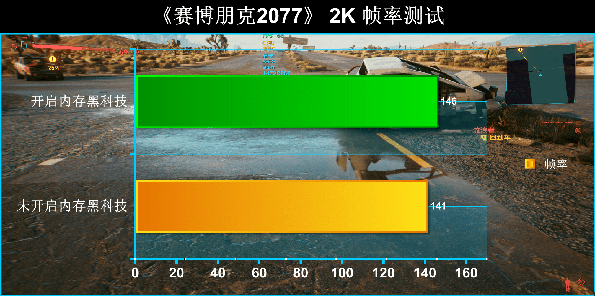 索泰NVIDIA GeForce RTX 4080《賽博朋克2077》的畫質設置為:2560×1440、光線追蹤:超級、開啟DLSS frame Generation,運行Benchmark未開啟內存黑科技的狀態下,得到平均141幀的成績。在開啟內存黑科技后,得到平均146幀的成績。內存黑科技再一次證明對游戲幀率提升是有用的。