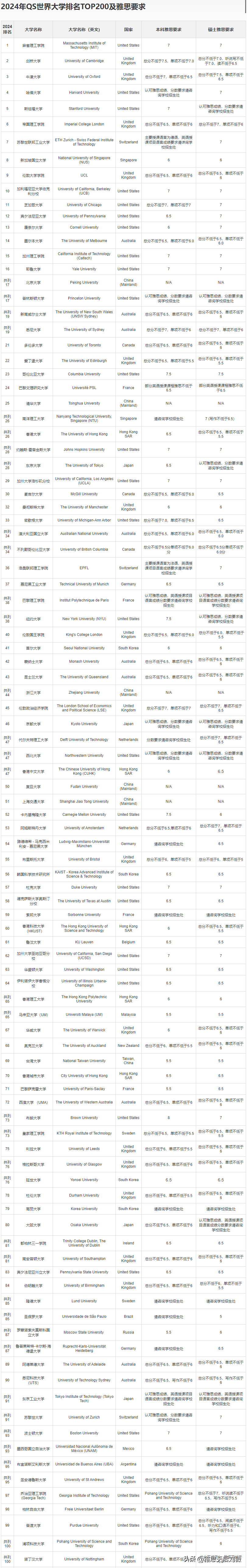 2024年QS100院校雅思要求匯總