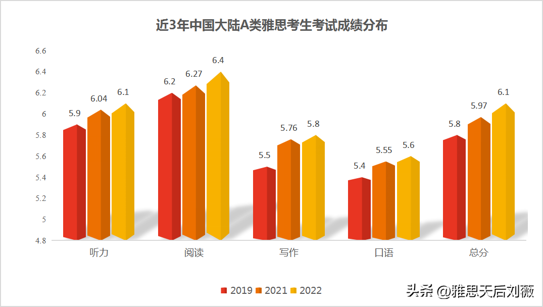 根據雅思官方最新發布的2022年全球雅思考生數據報告,2022年中國大陸雅思考生A類(學術類)的總分均分為6.1分,大陸考生在不同雅思分數的占比如下: