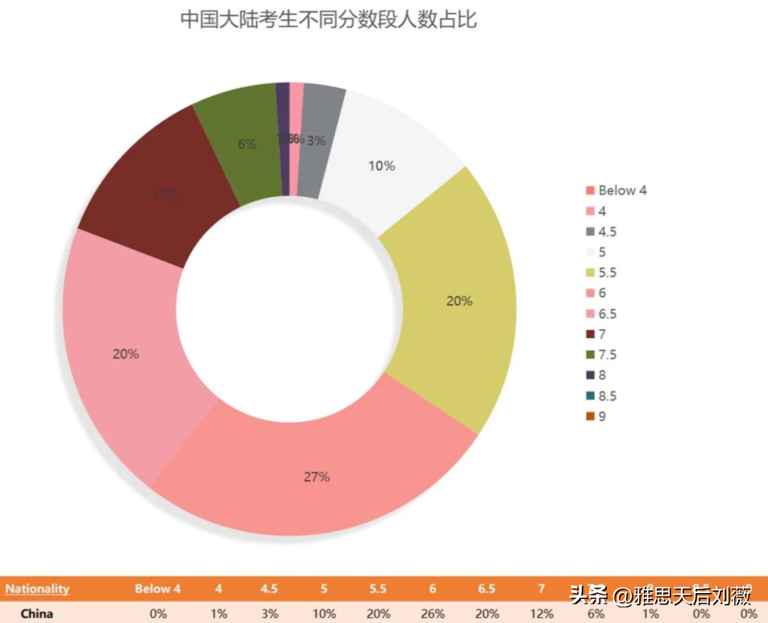 其中5.5、6.0和6.5這三個分數段集中了66%的考生;7分及以上占比19%;5分及以下占比14%。