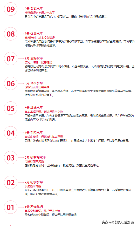 由于這種和國內考試不太一樣的計分方式,導致很多剛接觸的雅思小白對于各個分數的英語水平不是很了解:會誤以為9分聽著也沒有多高很好考吧?怎么那么多人連7分都考不到?大部分人的英語水平差不多是雅思幾分?