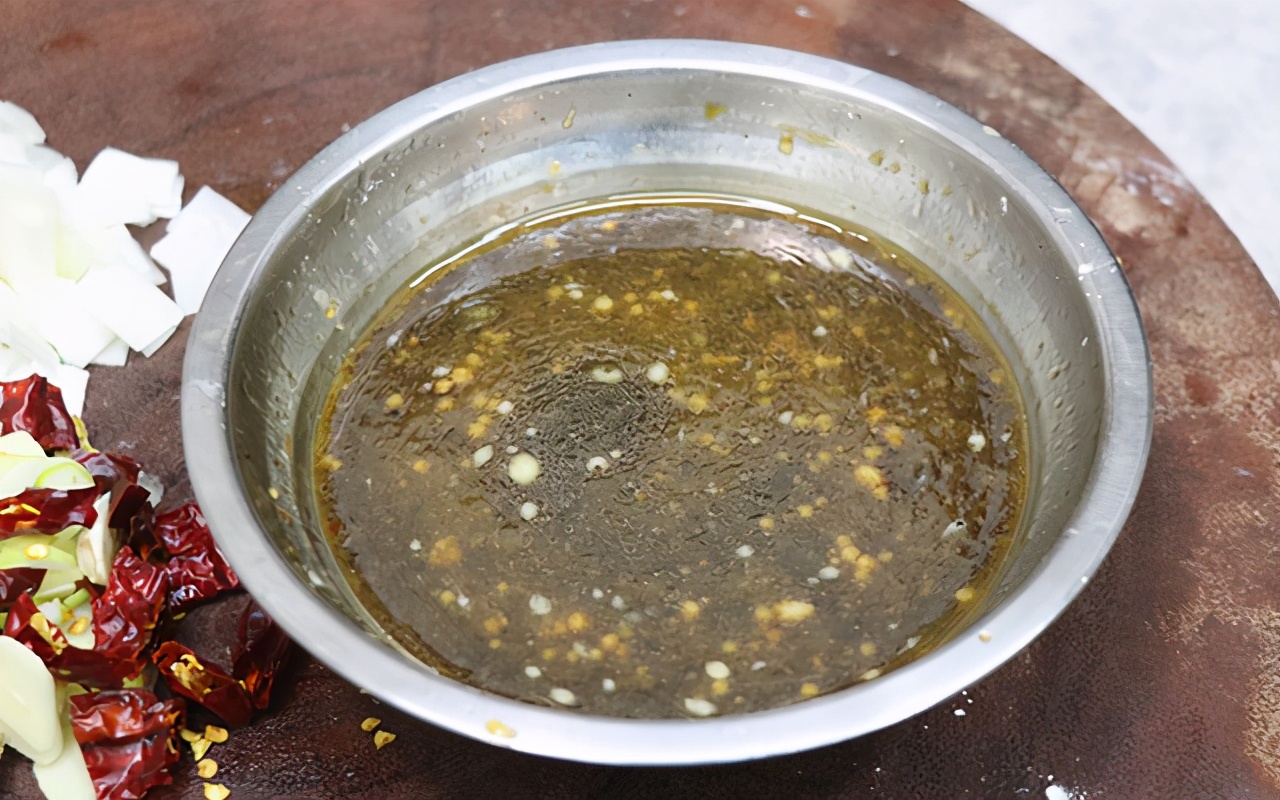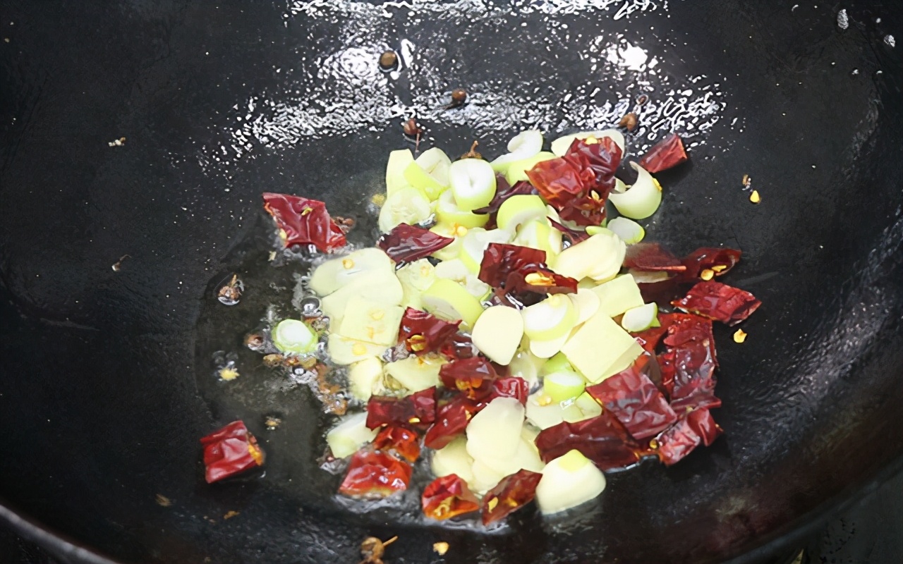 第九步:倒出國內多余的油,留少許底油;然后把干花椒下入鍋中炸出香味,再下入準備好的蔥、姜、蒜、干辣椒,一起來煸炒出香味。