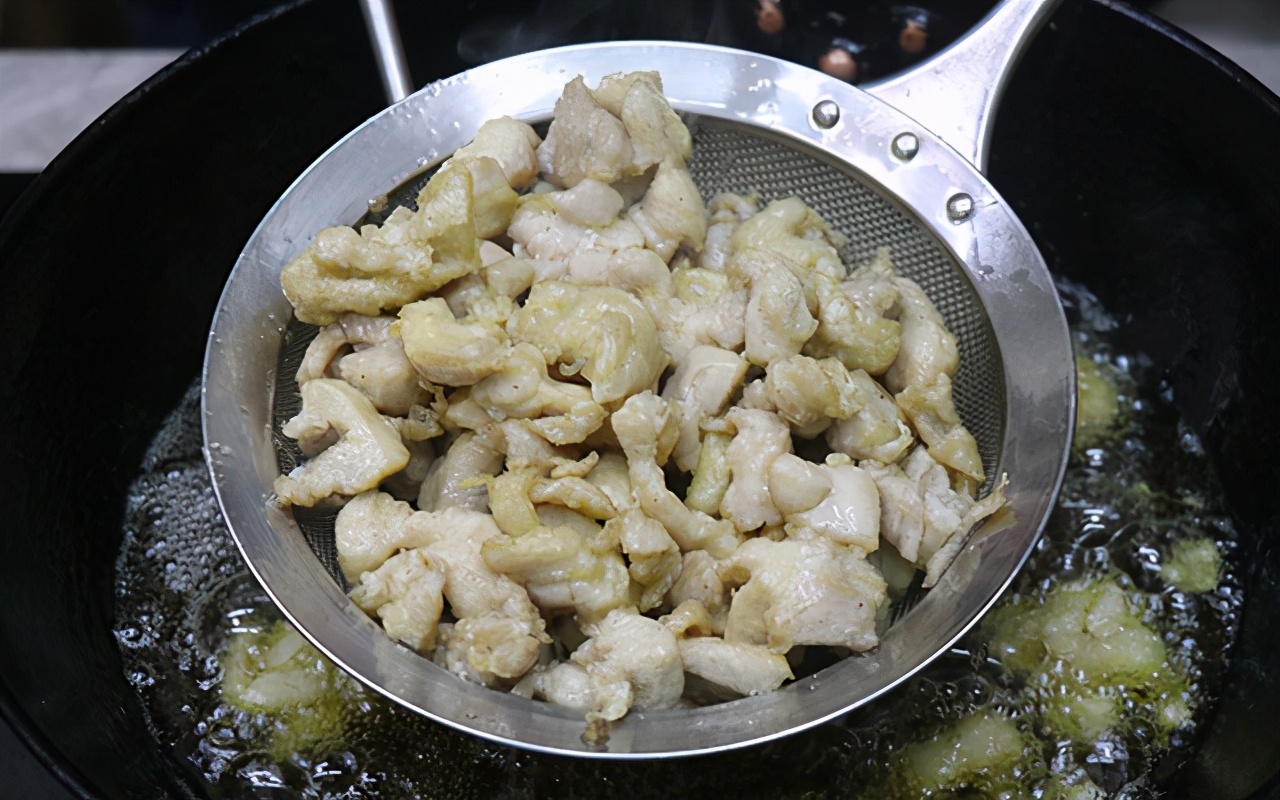 第八步:把油溫燒至五成熱,下入腌制好的雞丁,炸至稍稍定型,再用勺子攪散,把雞肉炸至斷生即可用漏勺撈出來控干油備用。