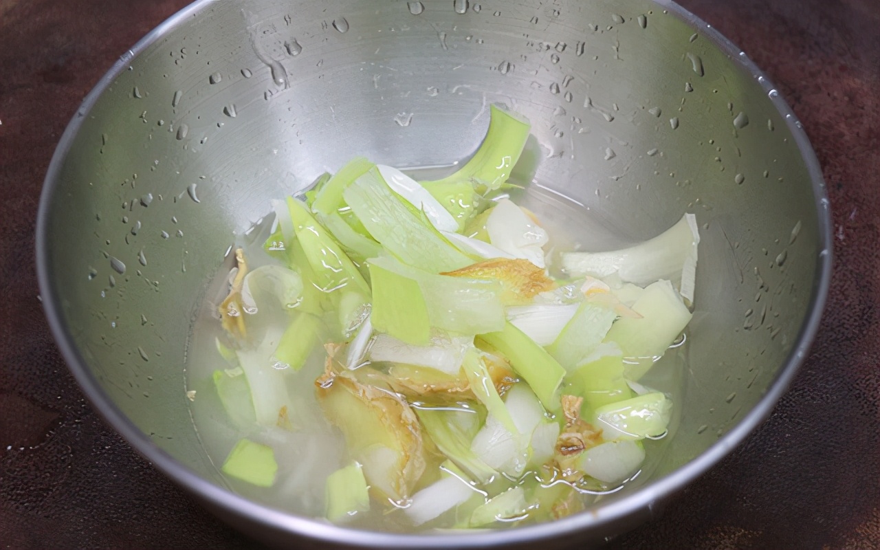 第二步:制作蔥姜水。大碗中加入適量清水,再加入大蔥和姜片,下手捏出里面的汁水即可。