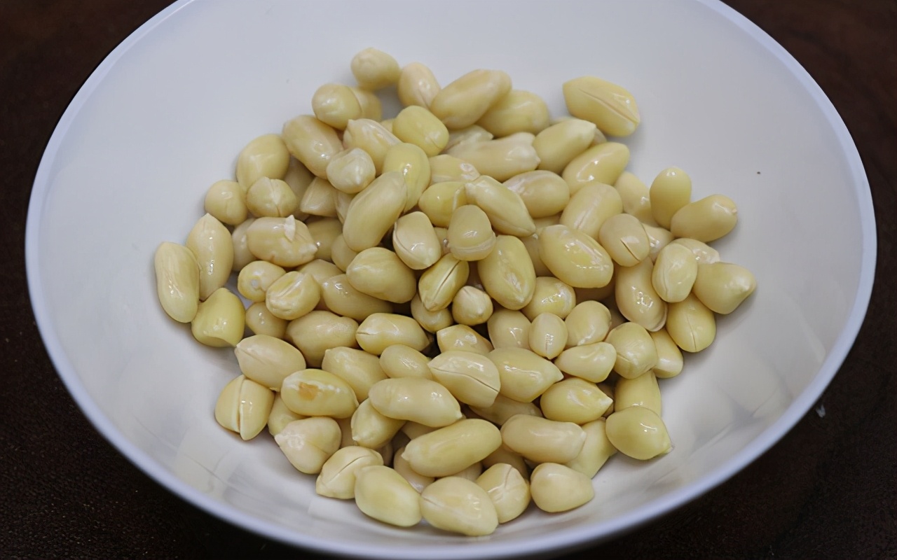 第四步:適量花生米提前用開水浸泡半個小時,然后去除花生衣備用;也可以不去花生衣,直接下鍋炸。