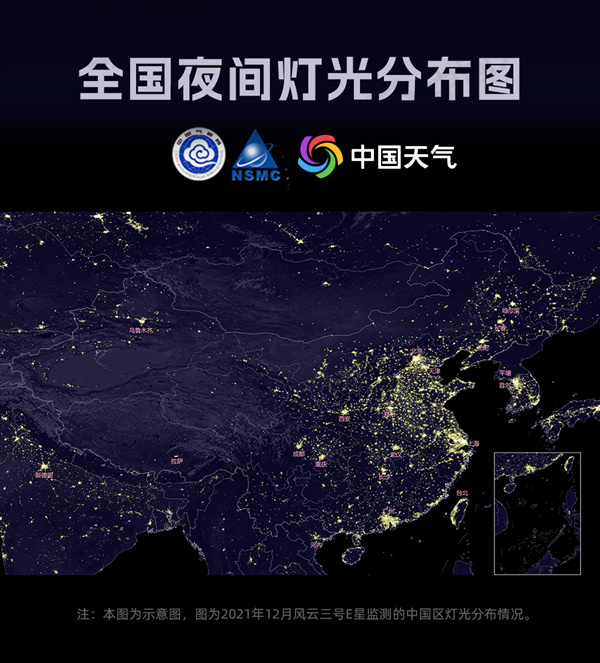 2021年12月風云三號E星監測的中國區燈光分布圖