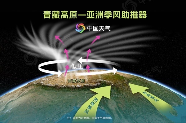 青藏高原遠離海洋,看似和季風沒有什么關聯,但實際上,它卻是亞洲季風的超級助推器。青藏高原總面積約240萬平方公里,平均海拔高度超過4000米。在夏季,這里能夠接受到更多的太陽輻射,吸收更多的熱能,從而成為一個巨大的熱源。地表上方的空氣被加熱后不斷上升,導致地面氣壓不斷降低,不得不抽吸外圍的氣流進行補給,于是就形成了一個強大的、逆時針旋轉的低壓中心。這個低壓就像一個超級助推器,將其南側的西南季風和東側的東南季風源源不斷地推向我國東部地區。