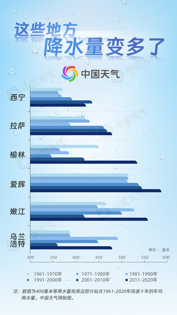在400毫米等雨線附近,大部分城市的降水量在近幾十年時間里保持著波動變化的趨勢,且部分城市降水量在增多。從1961年至2020年的逐十年平均降水量數據來看,黑龍江愛輝、青海西寧、陜西榆林、西藏拉薩等地變化較為明顯,都呈現了降水增多的趨勢。