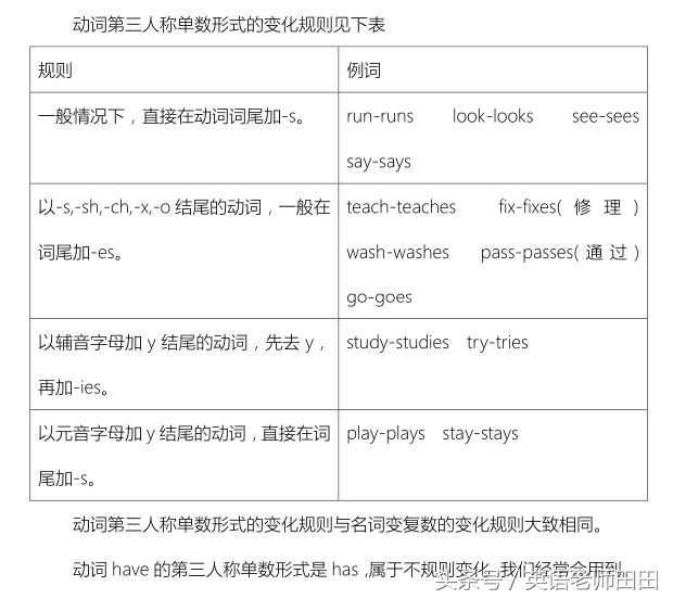 動詞原形變第三人稱單數的規則與發音規律同名詞單數變復數大致相同,請認真觀察。