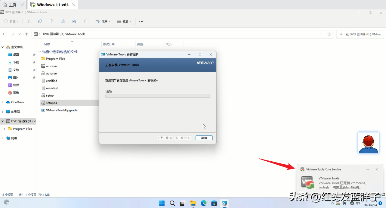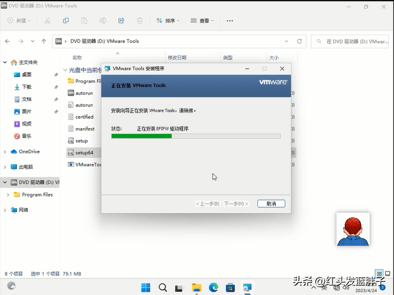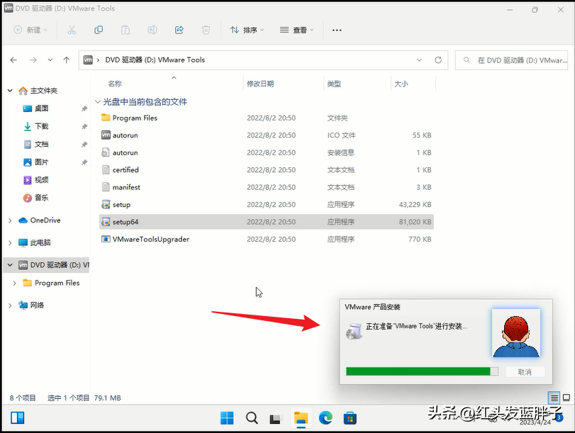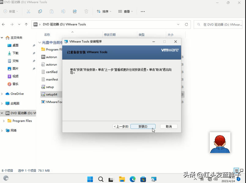VMware Tools 安裝程序是 ISO 映像文件,打開文件管理器,發現已經在windows11中,掛載了一個DVD驅動器,這個就是VMware Tools 安裝程序,點擊setup