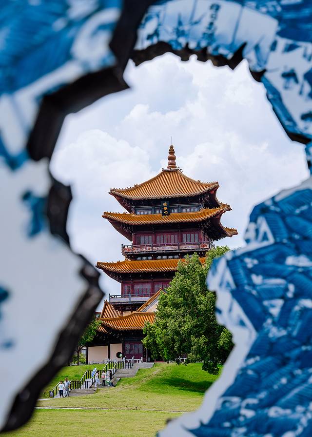 這里還有一個特別寶藏的機位,也在御窯廠遺址內,就是一個鏤空的青花瓷片雕塑造型,通過瓷片的鏤空,可以將遠處的龍珠閣框在這天然的畫框中,視角真的很絕!