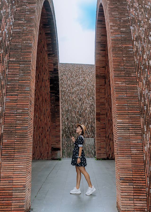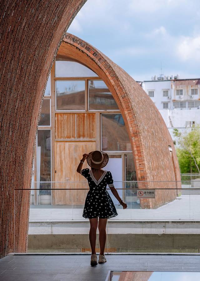 整個建筑采用極簡工業風,紅磚與鋼筋水泥的硬朗中和了大量弧線造型運用的輕柔之美,一座現代派又充滿國風氣度的建筑,就這樣讓我們著迷,沉浸其中,每一個角落,都忍不住要留存影像,永久珍藏。
