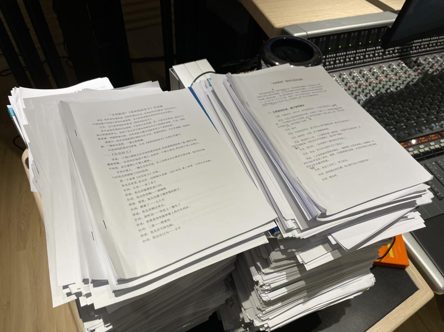 △錄音棚內堆著厚厚一摞志愿者們使用過的講述稿