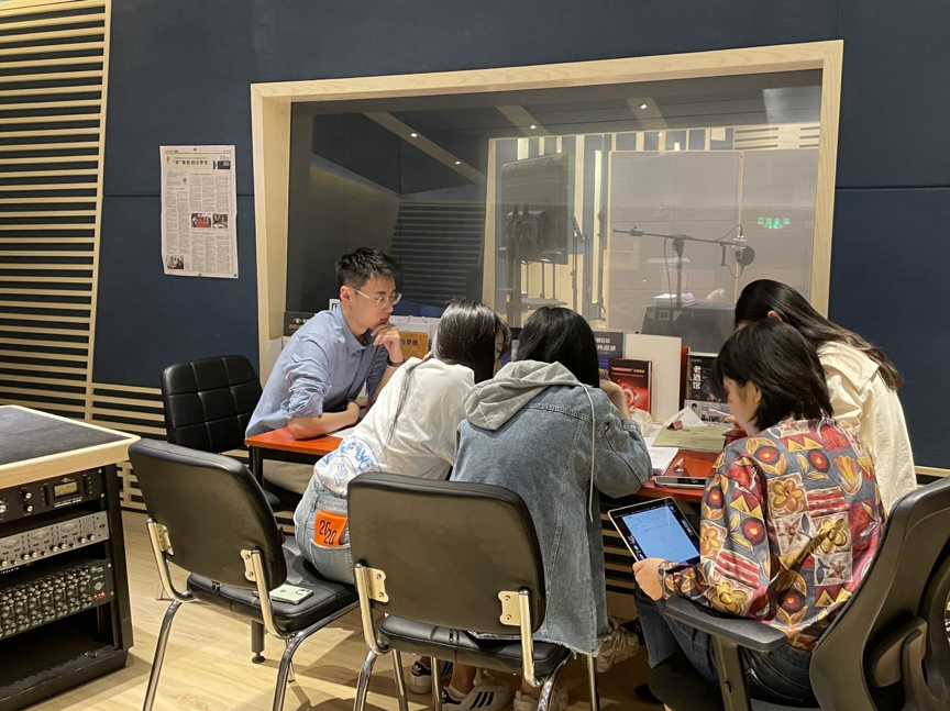 △志愿者汪銘正在為溫莫寒錄講述內容監棚