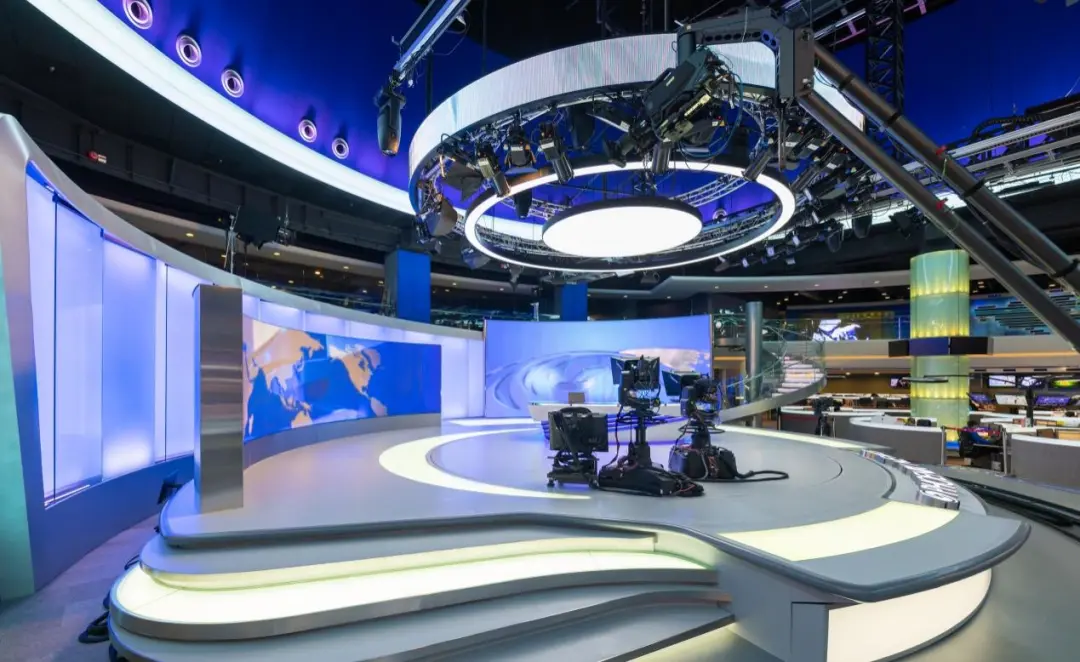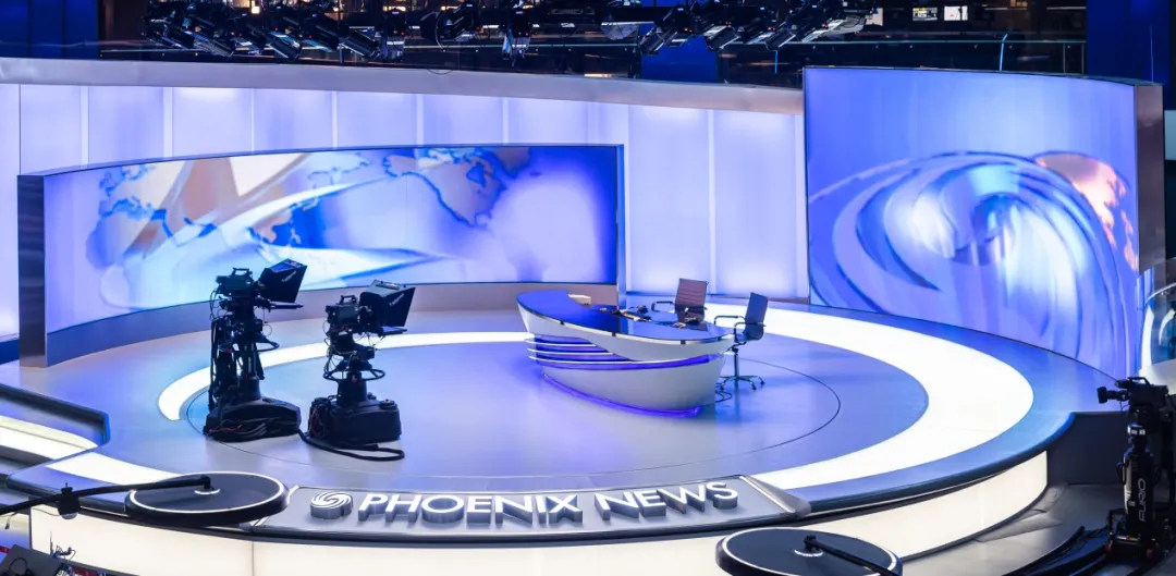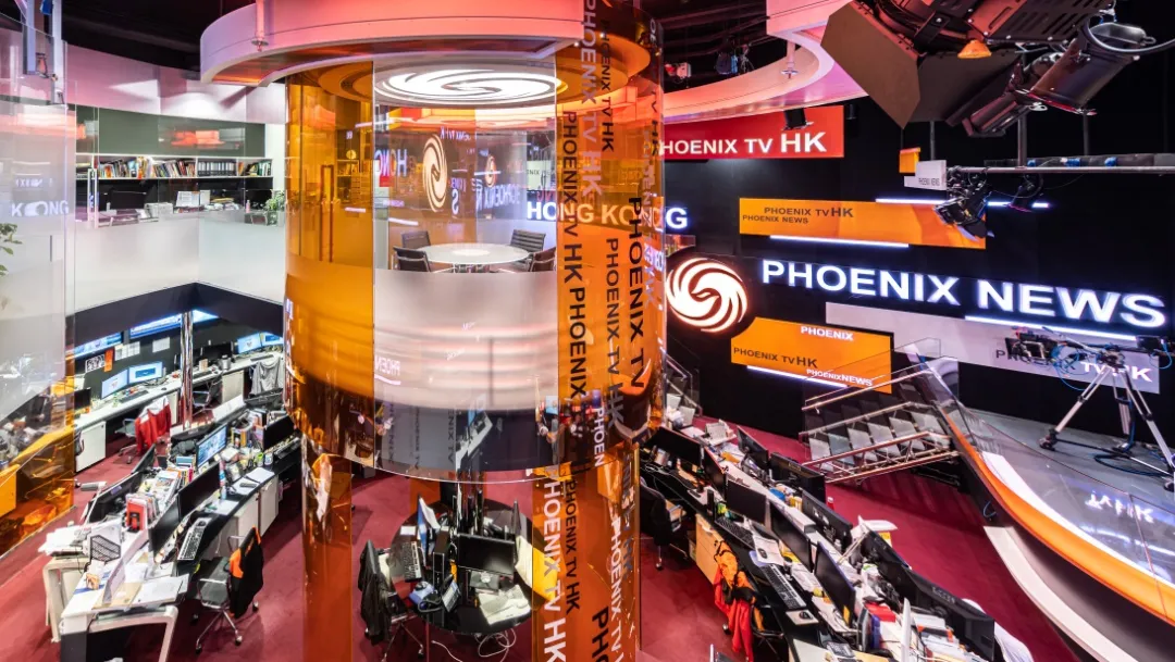 2009年鳳凰香港總部開始啟用的演播室,曾獲得亞廣聯年度最佳廣播工程獎。改造之后的主演播臺區域脫胎換骨,超高清巨幅曲面屏弧度流暢柔和,線條簡潔明朗;玻璃地面取代了傳統地臺,造型輕盈通透,色澤質感統一;以鳳凰臺標為地臺外形設計基礎,全環繞軌道攝像機和國際最先進時尚的燈光系統,再加上同步推出的元素豐富、布局優化、格調大氣的在線包裝系統,合力營造出引領華語媒體潮流的嶄新視覺體驗。