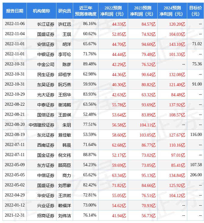 證券之星數據中心根據近三年發布的研報數據計算,中金公司陳彥研究員團隊對該股研究較為深入,近三年預測準確度均值高達89.48%,其預測2022年度歸屬凈利潤為盈利42.29億,根據現價換算的預測PE為24.72。