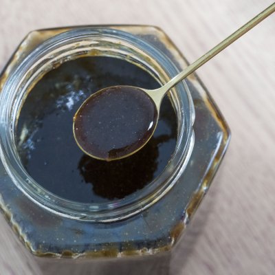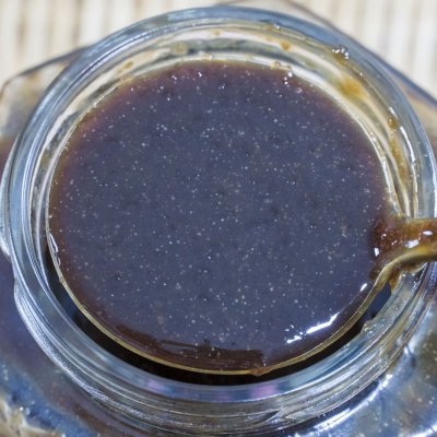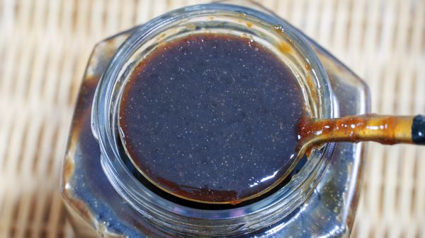 8、趁著熱度將秋梨膏倒入無油無水的玻璃瓶中,熱的時候秋梨膏比較好倒,要是完全涼透了就會特別的粘稠,就不是很好裝進瓶中了;