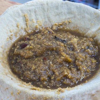 5、不燙手的時候我們來擠梨汁,用紗布包起來用力地把梨汁擠出來,梨渣就不要了;