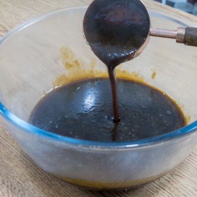 7、我熬了接近2個小時,這時候鍋里也非常濃稠了,半鍋梨汁就熬出了見底的這么一點梨膏,關火后倒出來連擠出來的梨汁的三分之一都沒有;