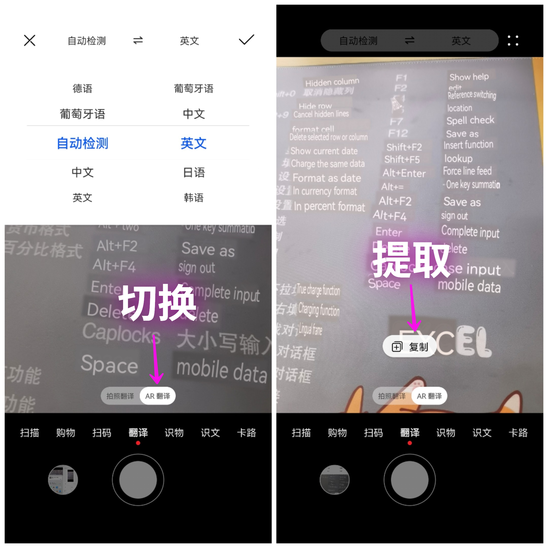 5.返回到翻譯功能界面,切換【AR翻譯】,識別語言選擇“自動檢測”,鏡頭指到哪兒實時翻譯,點擊屏幕鎖定內容,一鍵復制。