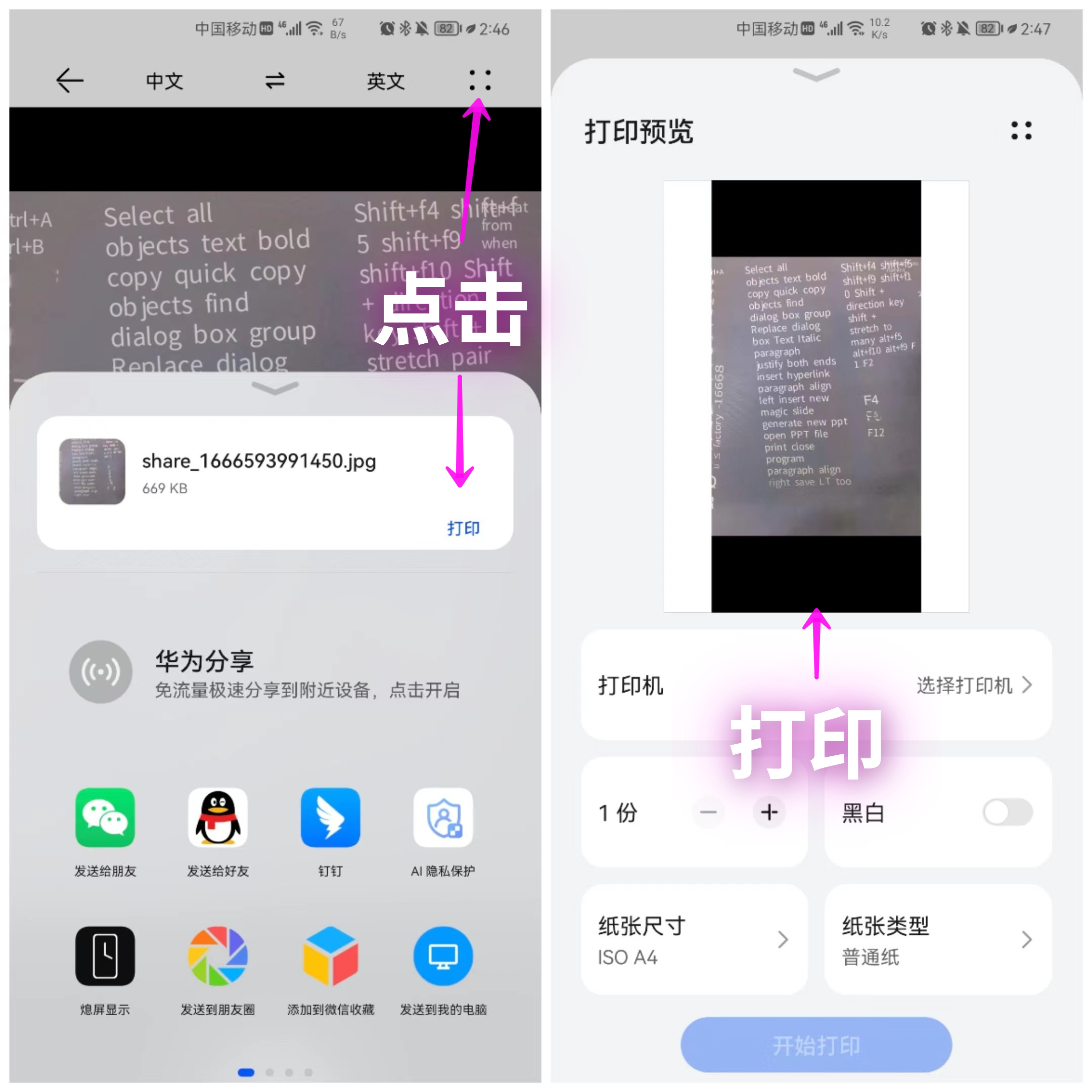 4.此外,點擊右上角的四個點,還能進行保存、分享、打印,將華為手機連接打印機,選擇打印數量、紙張尺寸、黑白效果。