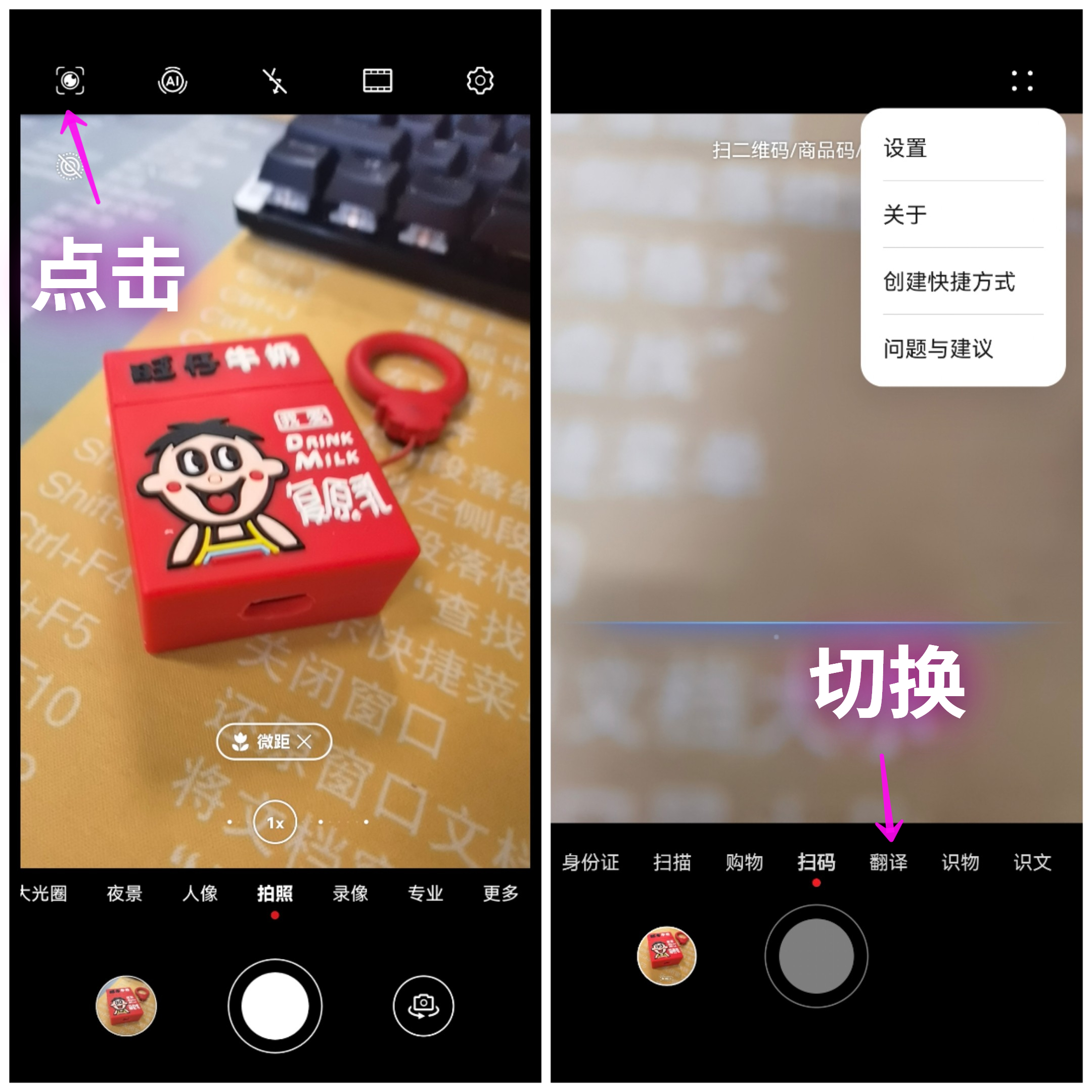 2.這里有很多識別功能,切換到【翻譯】,然后選擇識別語言和翻譯語言,支持10種語言,再將鏡頭對準文本并拍下來。