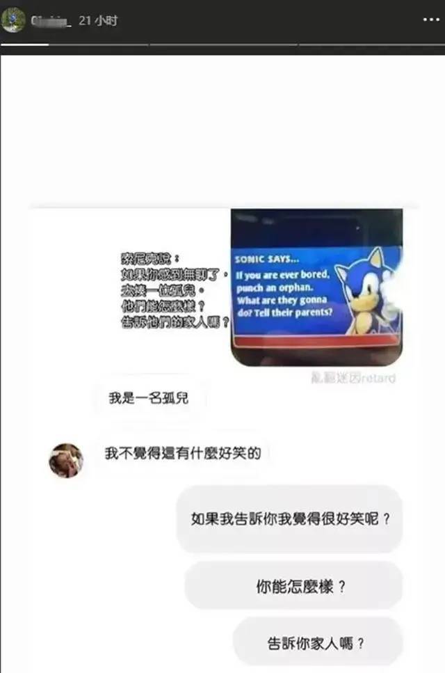 朋友傳了一張諷刺孤兒的圖片,邱煌祎生氣回懟: