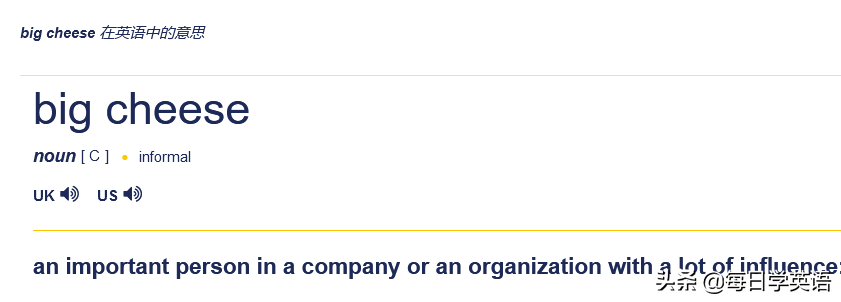Big cheese實際上是用來形容在重要位置上的人的。更多時候,它常用在形容公司老板。當然,也并不是所有的老板可以被稱為big cheese,如果他的領導能力或者掌權能力并不是很好,也不會用到這個短語。Big cheese是專門指組織中的非常有能力的重要人員的。