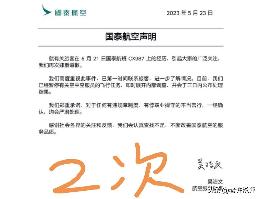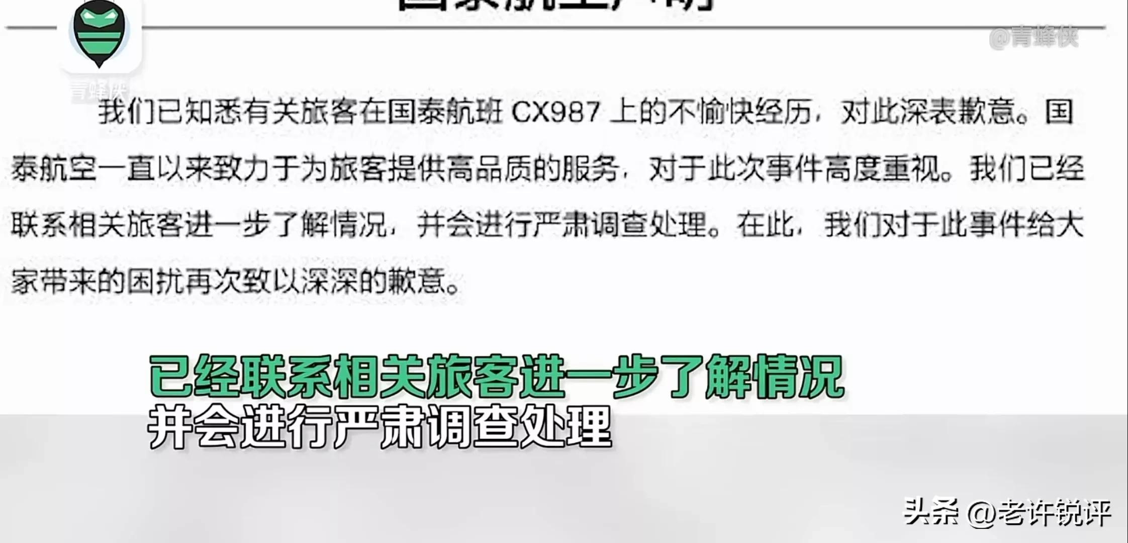 該事件曝光第二天,國泰航空就以低姿態的口氣發布聲明,一邊向乘客道歉一邊聲稱盡快調查處理。
