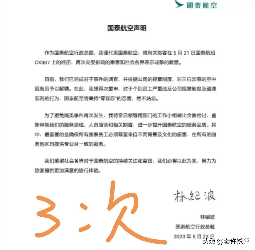 值得稱贊的是,這份聲明是以國泰航空行政總裁林紹波個人名義發出的,他還鄭重其事地在聲明中手寫簽名。