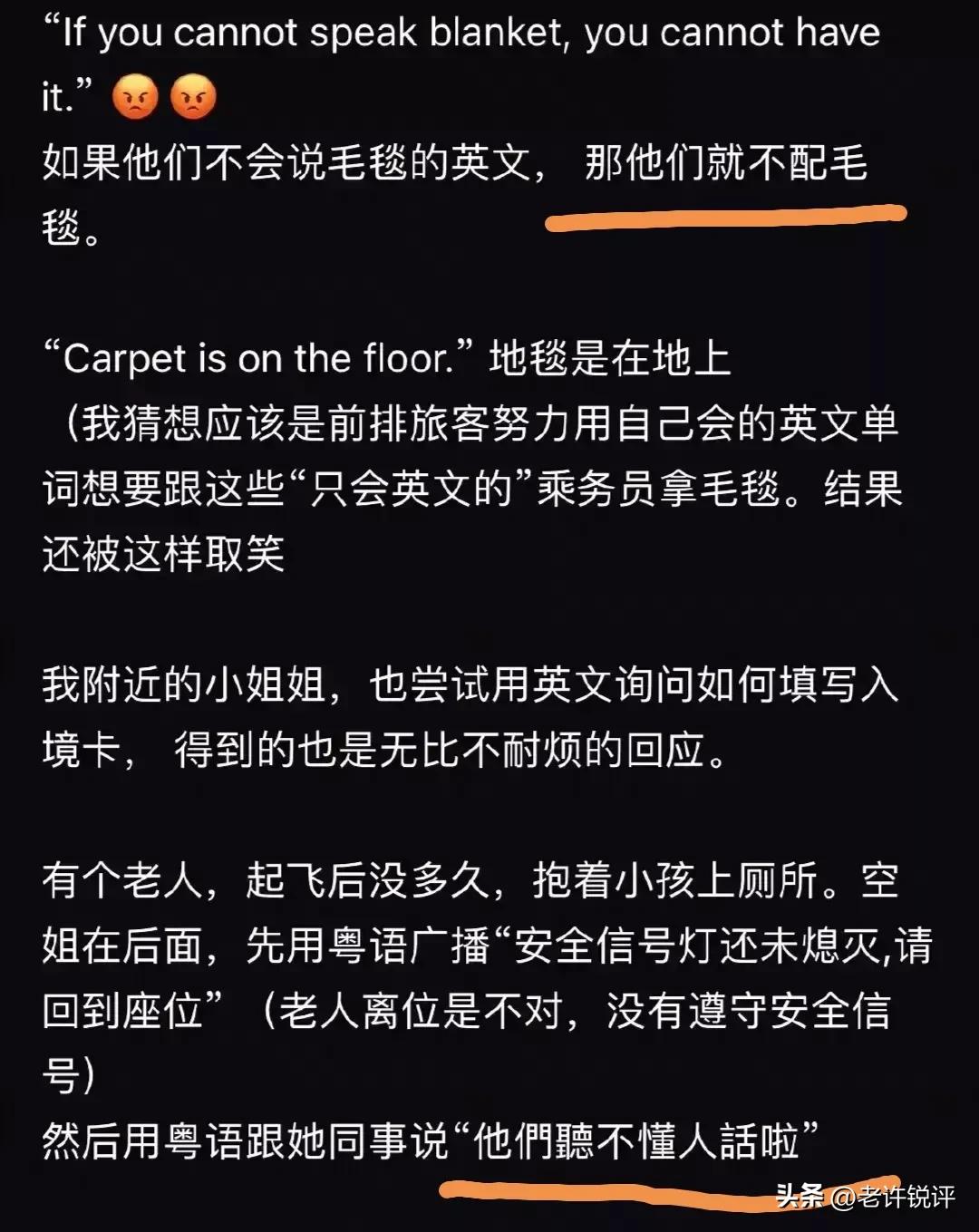 最終,這位空姐也沒有把毛毯提供給英語不好的乘客。