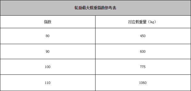 載重系數代表著輪胎最大能承受的重量,小編在嘮叨一句,安全行駛不要超載。例如上圖中輪胎載重系統91,對照表格,對于的載重系數為600多KG,四個輪子乘以四,我們可以得帶車子載重是2.4噸左右。