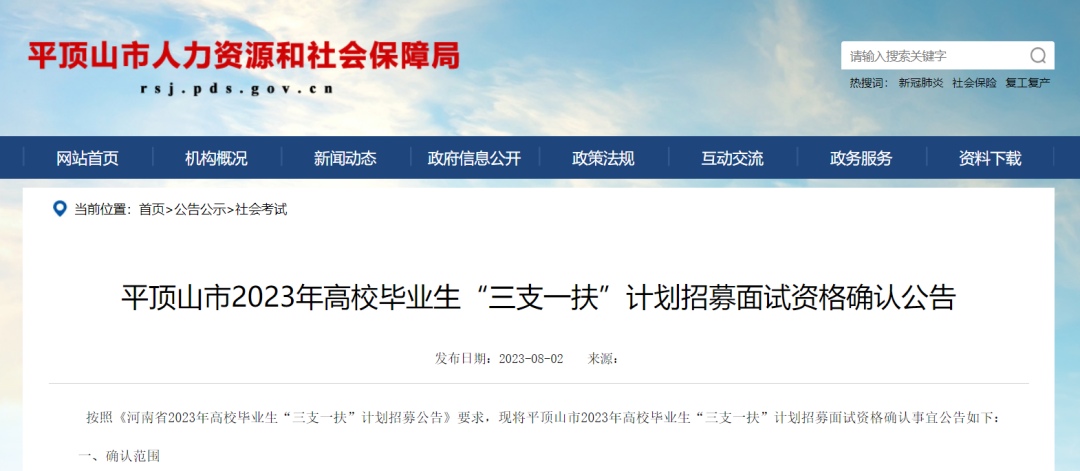 按照《河南省2023年高校畢業生“三支一扶”計劃招募公告》要求,現就平頂山市2023年高校畢業生“三支一扶”計劃招募面試有關事項公告如下: