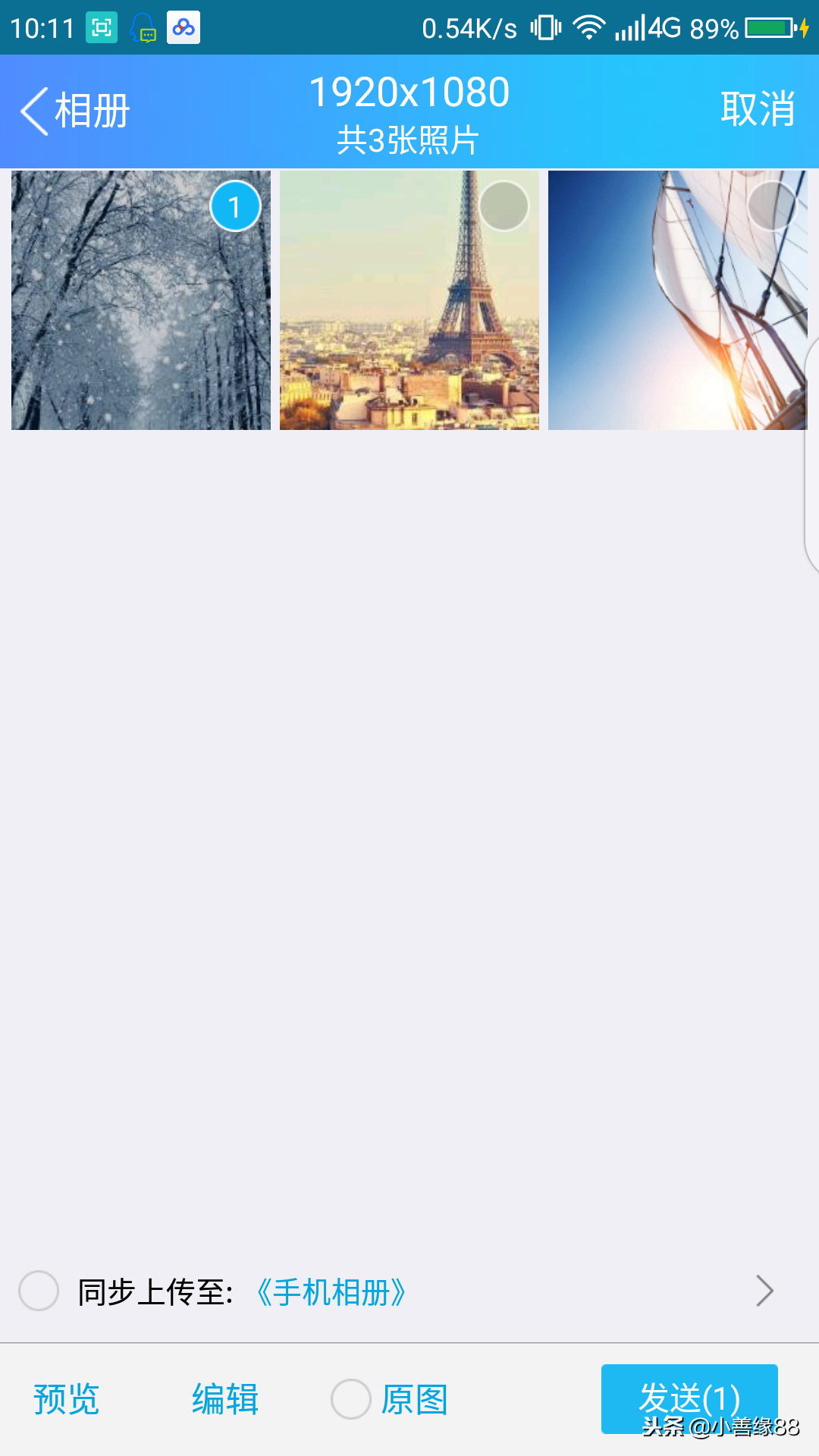選擇相冊,在相冊里選取你想發送圖片,選中圖片,此時別發送,選擇預覽