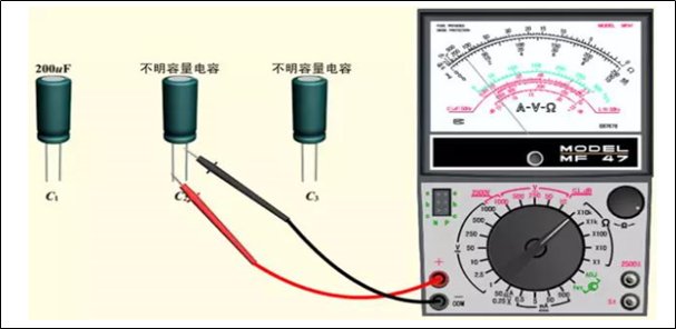 3.用萬用表電阻檔粗略鑒別5000PF以上容量電容的好壞 用萬用表電阻檔可大致鑒別5000PF以上電容器的好壞(5000PF以下者只能判斷電容器內部是否被擊穿)。檢查時把電阻檔量程放在量程高檔值,兩表筆分別與電容器兩端接觸,這時指針快速的擺動一下然后復原,反向連接,擺動的幅度比第一次更大,而后又復原,這樣的電容器是好的,電容器的容量越大,測量是電表指針擺動會越大.