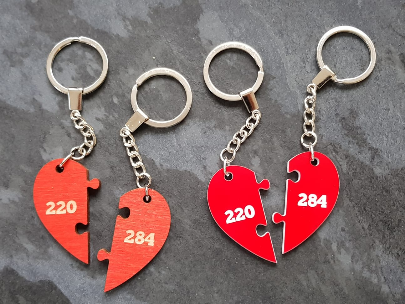 市面上你可能還可以買到由兩片分別刻有“220”和“284”的半邊心形拼成的鑰匙串或者首飾。人們購買它們,并將一半送給心愛的人,將另一半留給自己,我也做過這樣的事。相傳于古希臘,220 和 284 是友情和浪漫的象征,直到現在,仍有一些書呆子使用這個寓意。
