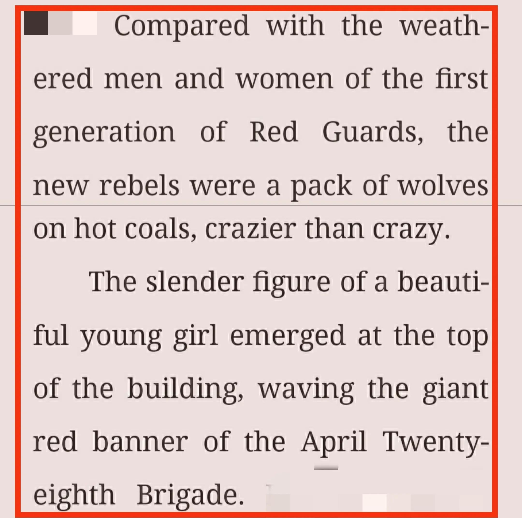與經歷過風雨飄搖的第一代紅衛兵相比(紅衛有男有女),新造反派簡直就是一群熱炭上的狼,比瘋子更瘋狂。樓頂出現了一個美麗少女纖細的身影,她揮舞著一面“四·二八”的大旗。
