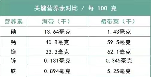 下圖是裙帶菜和海帶在關鍵營養素上的含量對比: