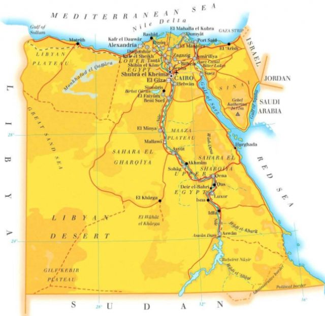現實中的埃及地圖,地圖中間的河流正是尼羅河。