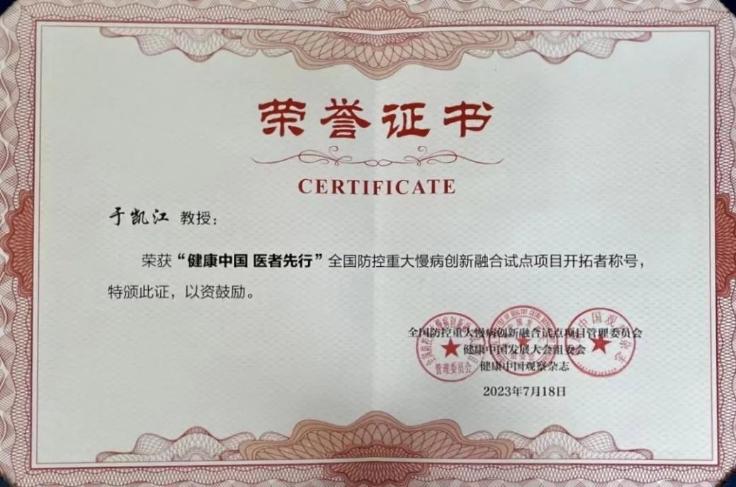 近日,2023健康中國發展大會全國防控重大慢病創新融合試點項目推進大會在北京舉行。哈爾濱醫科大學附屬第一醫院獲評首批全國防控重大慢病創新融合試點項目單位(黑龍江省唯一入選),于凱江教授獲評“健康中國 醫者先行”全國防控重大慢病創新融合試點項目開拓者榮譽稱號。