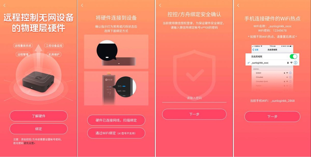 硬件搭建成功之后,手機端即可下載「向日葵遠程控制APP」,軟件設計得非常友好,小白用戶也能輕而易舉地上手,在向導的幫助下,整個綁定過程還是比較簡單的。在使用WiFi綁定向日葵控控A2時 ,目前僅支持2.4GHz無線網絡。在綁定向日葵控控A2之后,可以在「向日葵APP」中找到當前綁定的設備名稱,并可以實時查看A2當前連接主機的情況。