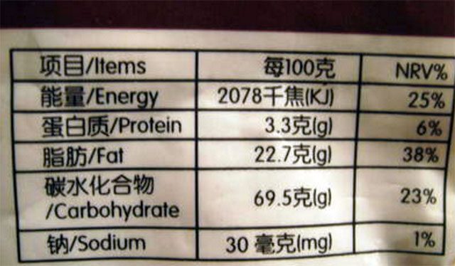 比如這個巧克力的熱量表,沒一百克的巧克力有2078KJ的熱量,我們用2078除以4等于500左右的大卡,這個時候我們再去衡量這個巧克力能不能吃,能吃多少。