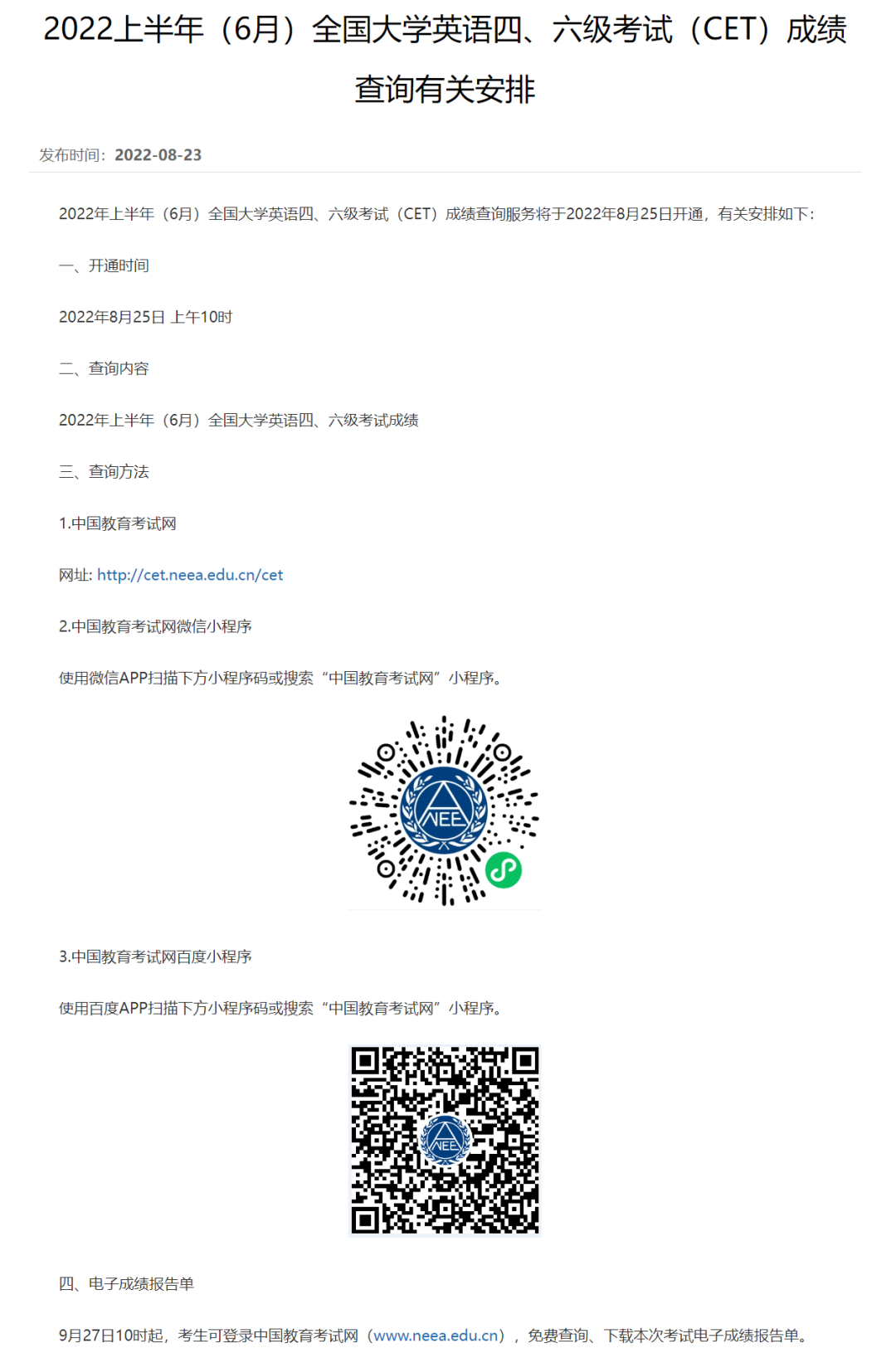2022上半年(6月)全國大學英語四、六級考試(CET)成績查詢有關安排