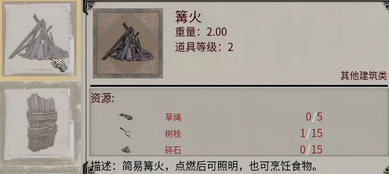 在游戲前期你要搭建第一個篝火,需要十多塊碎石加上十多根樹枝,初入游戲時我發現自己不知何時變得饑腸轆轆,眼前一片模糊,才醒悟過來該做點吃的,這時候,合起來一共需要搜集三十多份材料,顯得造篝火的小目標一下子沉重起來。